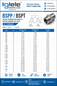BSP threads follow Whitworth thread form and are governed by applicable British standards.
