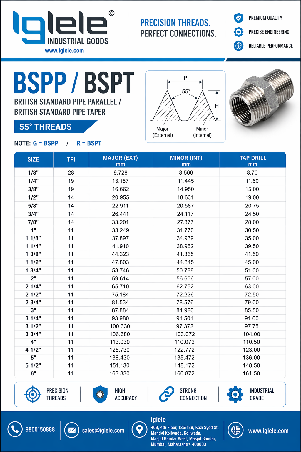 BSP threads use a 55 Degree thread angle and are available in two major forms: